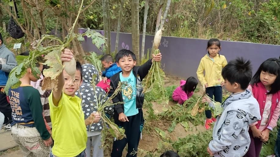 ▲台南虎山國小教師團隊營造生態小學森林課程,圖為老師與學生一同拔蘿蔔。(圖/教育部提供,以下皆同)