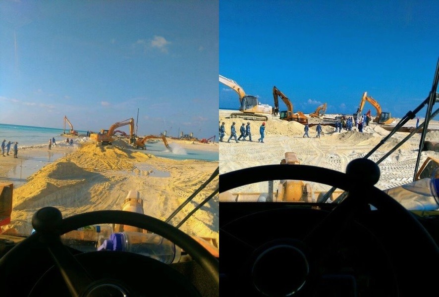 報導指出,照片中可看出工程高度機械化,有多張照片是從挖土機上拍攝,大型機器從海中抽取海沙,用大批挖土機不斷填海,也有大貨車將沙一次倒入海中的景象,完成填海的地區則築起防波堤,施工地也放有標語寫着,「亮劍深藍,築牢海盤,不辱使命,為國爭光。」