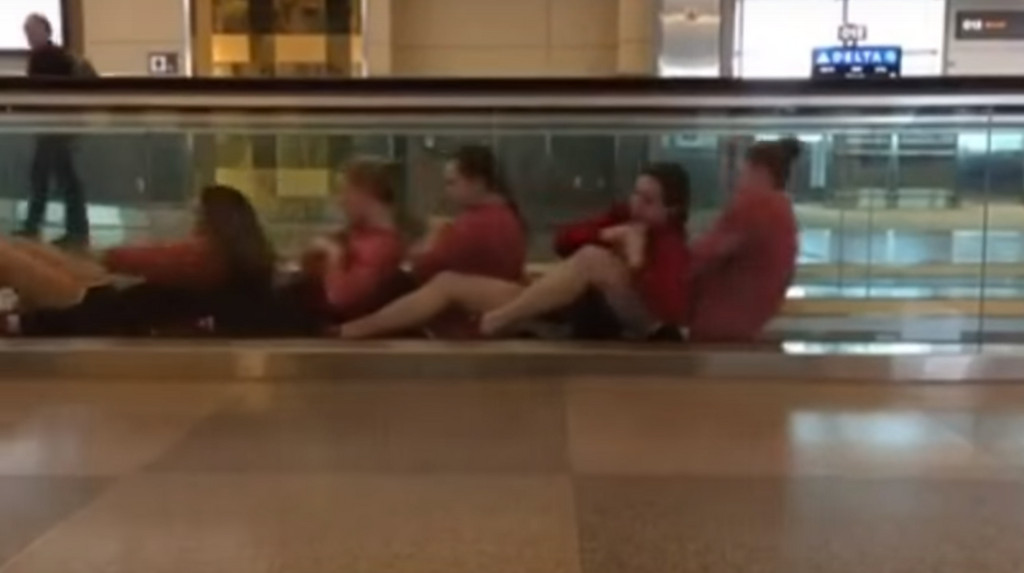 影片由曾打破紀錄的美國女泳手沃雷爾(Kelsi Worrell)上傳,她還留言表示,「有人說泳手都很怪,他可能說得沒錯。」她們被困北卡羅萊納州的羅利達拉姆機場將近7小時,為了打發時間,把歪腦筋動到電動步道上,一開始5位女孩坐在步道上隨著運轉往前,整齊劃一地做出划船動作,之後開始最擅長的游泳,不論是仰式、蛙式、蝶式還是自由式都架式十足。