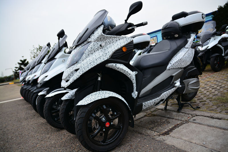 今年6月剛核准上路的宏佳騰3D-350,前二後一的車輪設計,搭載液壓傾斜系統,在過彎時輪胎能適度地順著過彎慣性做調整,增加抓地面積,安全性倍增。日前有101台3D-350兵分3路,集結台中火力發電廠,沿途從「心」探索不一樣的台灣之美。