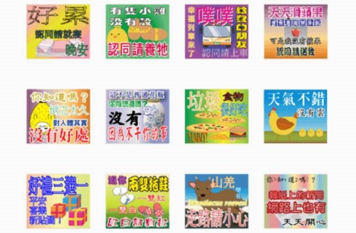 在這款「萬用長輩貼圖」中,說明寫道設計這款貼圖是展現孝心,「裡面蘊含的道理,是人生的累積」;貼圖中像是「有隻小雞沒有殼,認同請養牠」、「好累,認同請就寢,晚安」、「 財神說沒錢請去賺」、「認同請付錢」、「恐龍滅絕了,認同請分享」等。