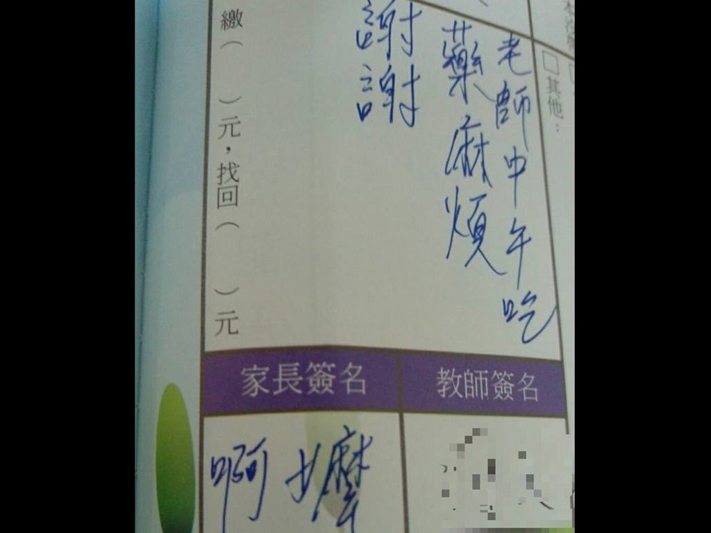 這位女老師在看連絡簿時,看到學生阿嬤留言,提醒老師要叫小孩「中午吃藥」,最後還在家長簽名欄處寫了「啊嬤」(應為阿嬤),讓老師覺得好古錐,直呼「所以我應該簽老師嗎?」
