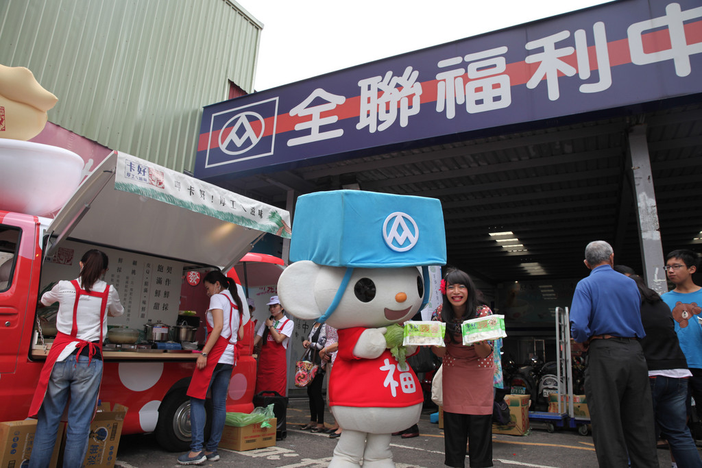 ▲桂冠「行動小食堂」今天上午停靠在全聯汐止康寧店,現場提供2小時的卡好水餃免費吃到飽。(圖/桂冠提供)