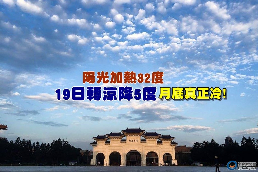 全台陽光普照「熱烘烘」,中央氣象局預報,18日各地維持晴朗穩地的天氣,在陽光持續加熱下,白天升溫快預估高溫上看32度,感覺偏熱,19日(周四)開始隨著東北風增強,北部、東北部漸漸轉涼,降溫約5度剩26度。天氣風險公司則提醒,未來一周氣溫仍偏暖,真正有感覺較「冷」的冷空氣南下要到下周。