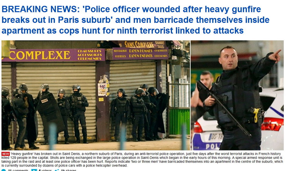 警方稱,有數名嫌犯躲在公寓裡,至少3名員警在槍戰中受傷。槍戰在當地時間18日清晨已持續至少3個小時。