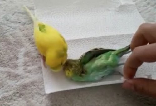 這是一幅讓人心碎的畫面。一隻黃色鸚鵡因為無法沒接受同伴的逝去,不斷用鳥喙碰觸試圖喚醒牠,彷彿還抱着一絲希望對方會恢復生命跡象。
