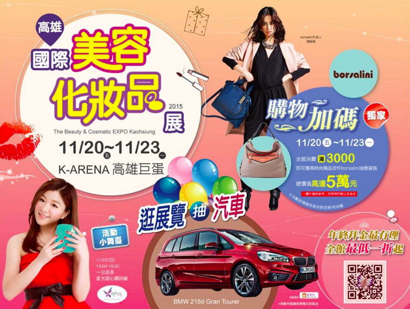 喜愛精品皮件的朋友有福了!美容展全館消費滿3,000元,即可至贈品區兌換時尚精品皮件borsalini抽獎聯,總價超過五萬元潮流美包等你來拿。展場消費任何一張發票登錄還有機會把名車BMW開回家!加碼贈送百萬購物金!或是來場豐富心靈的好電影,憑美容展『全票、優待票』票根,至國賓影城消費享爆米花及碳酸飲品單點五折優惠,吃的拿的看的,通通美得到位!