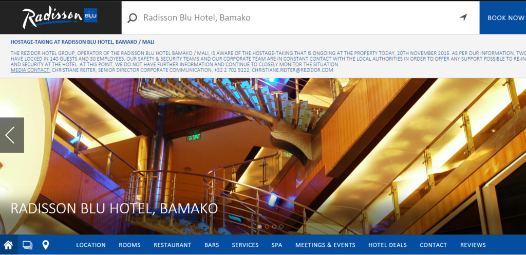 ▲馬利麗笙酒店(Radisson blu hote)傳槍響,聖戰士挾持170名人質。(圖/翻攝自馬利麗笙酒店網站)
