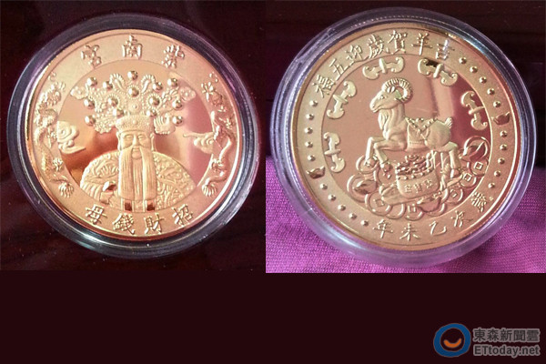 ▲紫南宮發放金色羊年紀念幣,領取期限截至105年3月底。(圖/南投竹山鎮紫南宮提供,請勿隨意翻拍,以免侵權。)