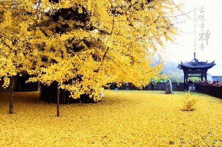 陝西省西安市古觀音禪寺內有一棵歷史悠久的銀杏樹,共有1400多年歷史,落葉時金黃的樹葉鋪滿一地,宛如一塊金黃色的地毯。據了解,該棵銀杏樹在終南山下,相傳是唐太宗李世民親手栽種,且已被國家列入古樹名木保護名錄。