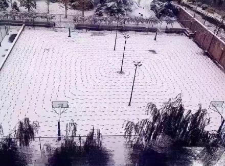 微博出現一個話題「北京雪後現奇人」,原來是有人在籃球場的雪地上走,遵循著逐層由外到內的規律,走成一個個四方圈,最後腳印把整個球場填滿,看起來很壯觀。(上圖/取自微博,下同)