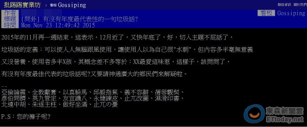 這位網友在PTT的八卦版po文表示,「2015年的11月再一週結束,這表示,12月近了,又快年底了,好,切入主題不屁話了。垃圾話的定義:可以是人人無腦跟風使用,讓使用人以為自己很『水朝』,但內容多半毫無意義又沒營養。有沒有年度最佳代表的垃圾話呢?又要請神通廣大的鄉民們來解疑啦。」