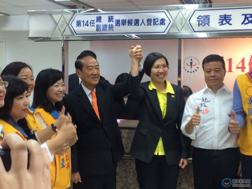 2016大選倒數53天,中選會23到27日開放第14任正副總統與第9屆立委選舉候選人的參選登記。三組正副總統候選人中,親民黨「宋瑩配」搶頭香選在24日上午11時登記;國民黨「朱玄配」挑25日9時15分登記;民進黨「英仁配」則選擇最後一天,於27日上午10時登記。