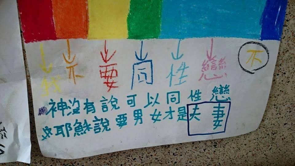 「學術工作者力挺婚姻平權陣線」臉書分享了某原住民教會的主日學教室學生作品,畫作中雖充滿繽紛色彩及各式彩虹,但有些卻被畫上「大大的叉」,上頭的文字也引人注目,「我不要同性戀」、「反同性戀」、「神沒有說可以同性戀」等反同言論。