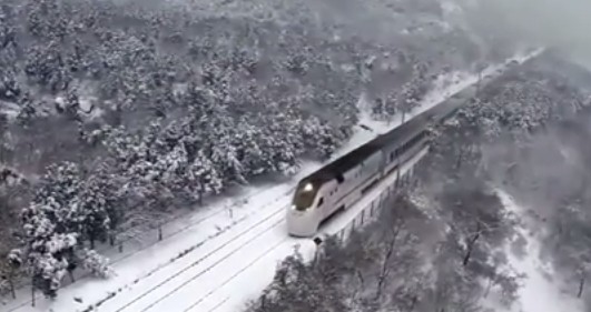 雄偉的長城盤踞在蒼茫的雪地裡,這是民眾用空拍機所拍下的景象,地點在北京郊區的八達嶺。漫天的飛雪掩蓋了所有的色彩,只剩下白茫茫的一片,火車行駛在雪地裡,串聯起北國冬季之美。