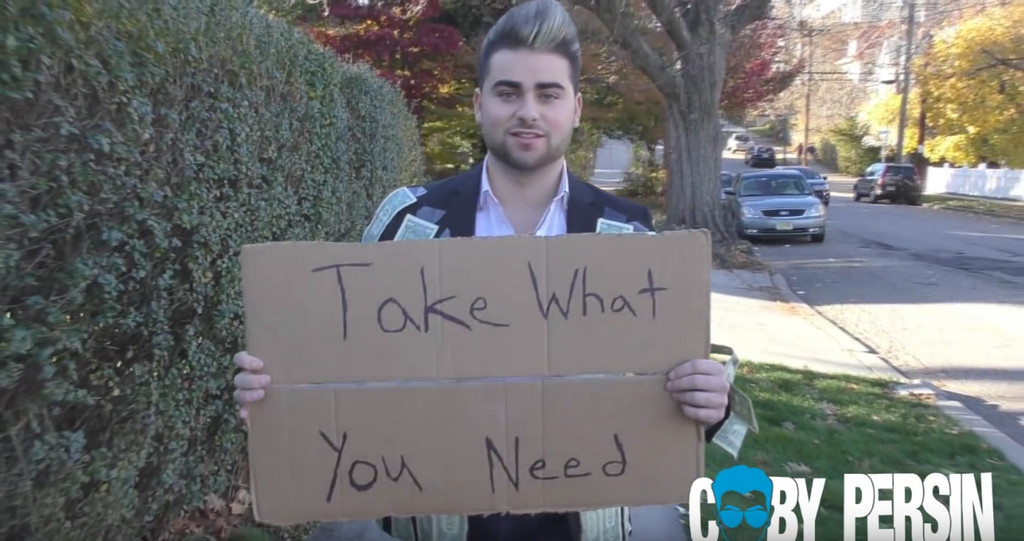網路紅人布里森(Coby Persin)在美國紐約街頭進行貪婪測驗,他在西裝上貼滿1元美金(約33元台幣),帶著寫有「拿取你所需要」的牌子到處走動,不少路人秉持著「不拿白不拿」的心態,一連撕走了10張美金,出乎意料的是一名流浪漢只拿2張,並要他把剩下的拿去給需要的人。