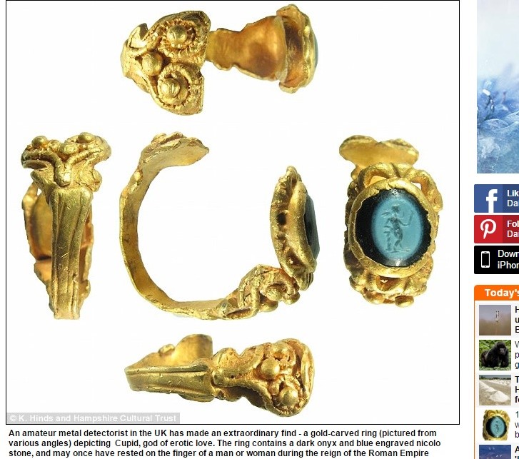 英國一名業餘金屬探測員在坦利村(Tangley)發現1枚古羅馬的黃金戒指。這枚戒指上還刻有愛神邱比特的圖案,經過鑑定後得知,該戒指的年代,可追溯自距今1700年前的羅馬帝國時代。