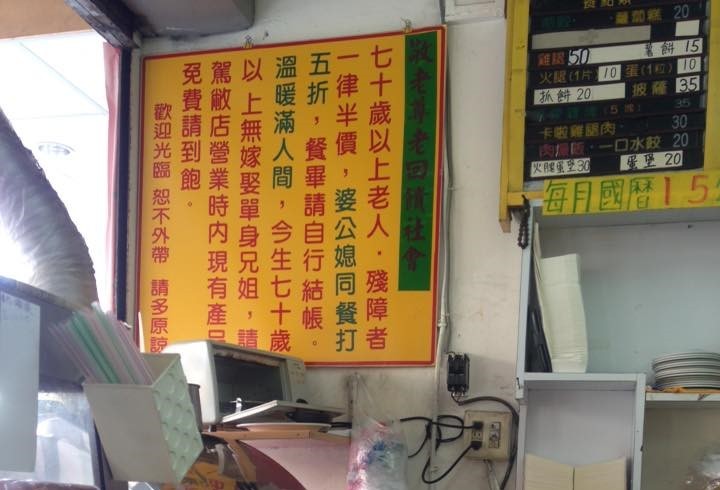 早餐店的招牌寫道,「敬老尊老回饋社會,70歲以上老人、殘障者一律半價,婆公媳同餐打5折,餐畢自行結帳。溫暖滿人間,今生70歲以上無嫁娶單身兄姐,請駕敝店營業時內,現有產品免費請到飽。」