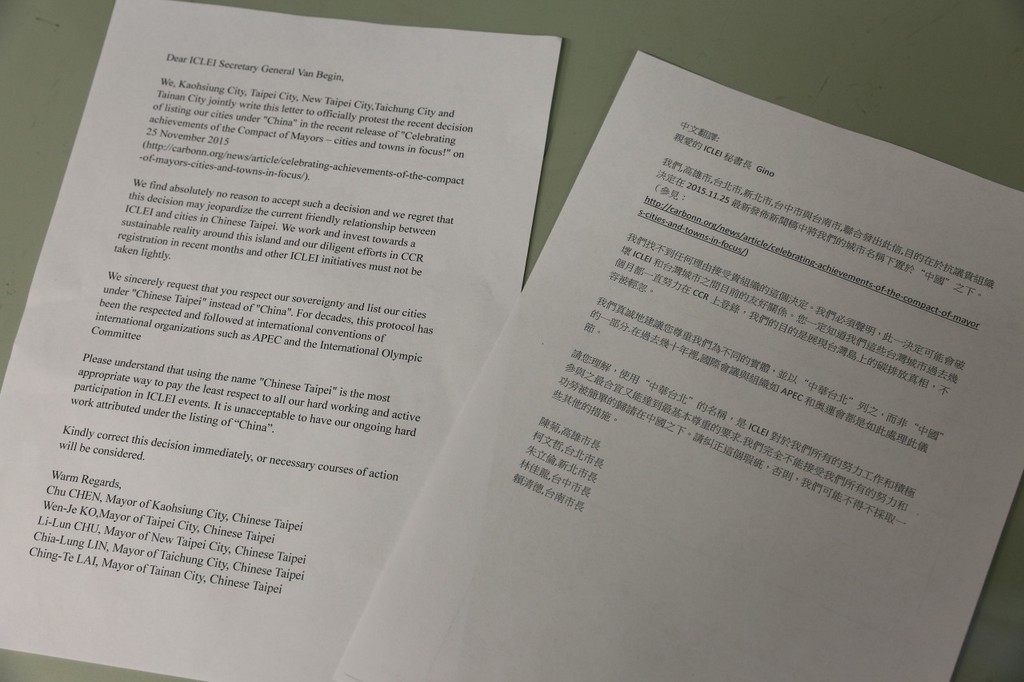 信中也強調,希望ICLEI尊重台灣與中國為不同實體的事實,並以「中華台北」稱呼,而非「中國的一部分」,盼能更正這個瑕疵,否則五都可能不得不採取其他措施來表達立場。