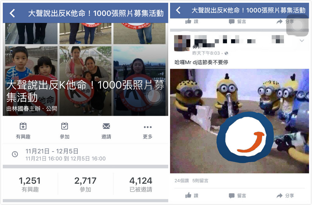 林國春於活動中表示,要募集1000名支持者與反K他命的圓牌合照。但合照的人少之又少,反而是一堆鬧事的網友貼出疑似毒品、白粉、吸食器的照片,無聊當有趣瘋狂洗版;警方調查後發現,多是屁孩引用網路搜尋的照片來嗆聲、留言,並無構成刑責,也將追查版上可疑份子,到案釐清有無涉毒。