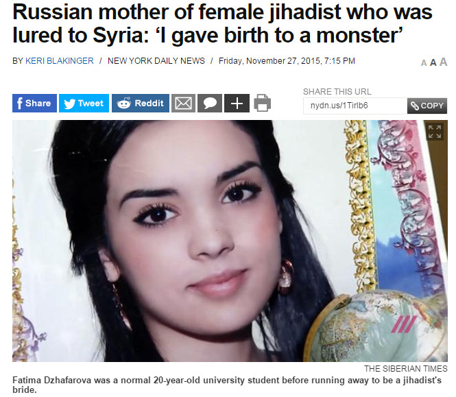 ▲俄羅斯一名女大生,在與伊斯蘭國成員相愛後,遠赴敘利亞投入聖戰,她的母親受訪說,「我生了一個惡魔!」(圖/翻攝自NewYorkDailyNews)