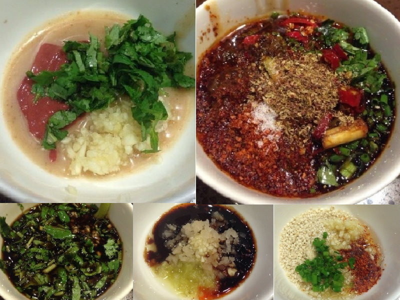 4.香油配芝麻、花生粒、蒜泥、乾辣椒粉、蔥花。