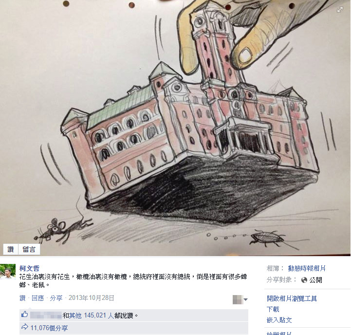 柯文哲以一幅總統府被掀開後,底下跑出許多老鼠、蟑螂的圖畫,圖說裡寫道:「花生油裏沒有花生,橄欖油裏沒有橄欖,總統府裡面沒有總統,倒是裡面有很多蟑螂、老鼠。」如今看來格外諷刺。