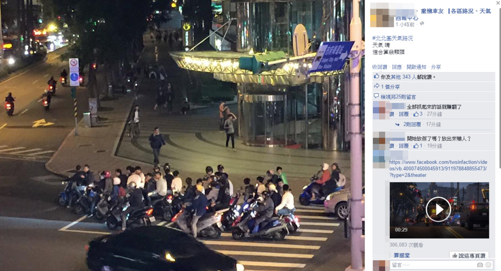 目擊民眾29日傍晚近6時在「重機車友▕ 各區路況、天氣回報中心」臉書社團PO文戲稱:「北北基天氣晴,適合算幾顆頭。」只見照片中,基隆路信義路交叉口,10幾輛機車停在待轉區,幾名年輕人全部都沒戴安全帽,雙載停在紅綠燈前,行徑囂張,畫面相當「壯觀」。