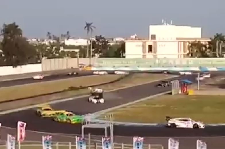 比賽開始後沒多久,車輛陸續經過S型彎道,1部保時捷跑車疑因車速過快失控,直接衝撞上前方的荷蘭SAKER賽車,並飛出車道,車體零件頓時噴散一地,還差點翻車,而SAKER也被撞出車道,車體外殼散落;現場觀眾看這驚險的一幕,驚叫聲四起,而其他選手的車輛也被嚇到,趕緊減速閃過。