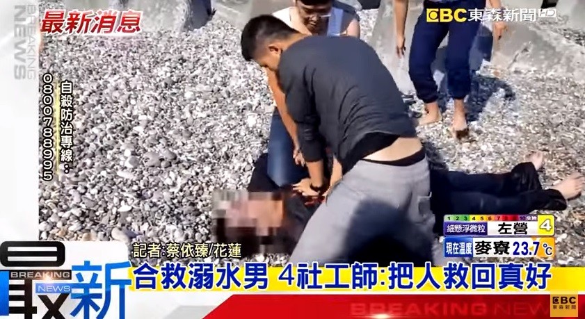 熱心助人真讓人覺得溫暖!一名男子日前在花蓮南濱公園跳海輕生,當時有4名門諾醫院的社工師見狀,趕緊輪流施做CPR,過程中還不停呼喊,「加油啊!」「聽得到聲音嘛?」一直想喚回男子的意識,並趕緊打電話報警,最後救護車趕到,將人送往醫院,救回一命,也讓社工師說,「人救回來的感覺真好!」