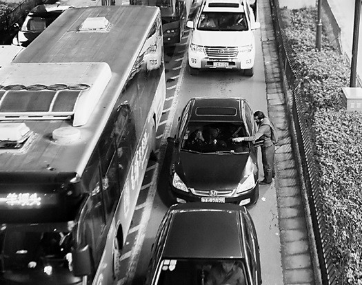 另一位潘姓駕駛前段時間回杭州,開到新塘路口時,遠遠就看到那根雞毛撢子,「那個人向前一輛車討到錢後,就走向我,在車頭一側站定後,開始在我的車窗撢了又撢,只好掏出10塊錢給他,真拿這種人沒辦法,不情願也得給,不然脫不了身。」
