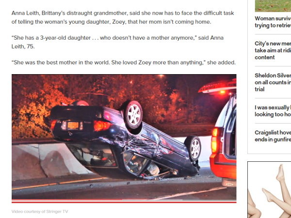美國紐約上月29日凌晨,發生一起交通意外。一名單親媽媽駕車行經高速公路時,車輛意外翻覆損毀,但她卻毫髮無傷;不料當她要返回車子拿取個人財物時,卻遭另一輛疾駛而來的轎車撞飛,送醫後傷重不治,讓人不勝唏噓。