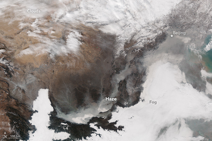 NASA這圖片拍攝於11月30日,最明亮的部分就是霧和雲,因為空氣污染,這些區域顯示在衛星圖上的時候邊緣是黃色或是灰色,其他沒有雲層的地方,城市都被霧霾完全遮住。