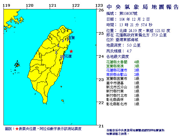 中央氣象局表示,下午1時21分在花蓮縣政府東偏北方37.9公里。位於台灣東部海域,發生芮氏規模4.7地震,各地最大震度,花蓮縣太魯閣4級、宜蘭縣南澳3級、花蓮縣花蓮市、南投縣合歡山2級、宜蘭縣宜蘭市及新北市五分山和台中市德基等皆為1級。