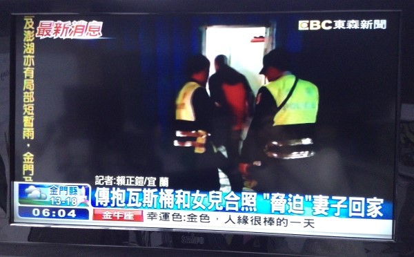 ▲黃男將女兒與瓦斯桶的合照傳給離家的妻子,企圖逼對方回來談判。(圖/東森新聞)