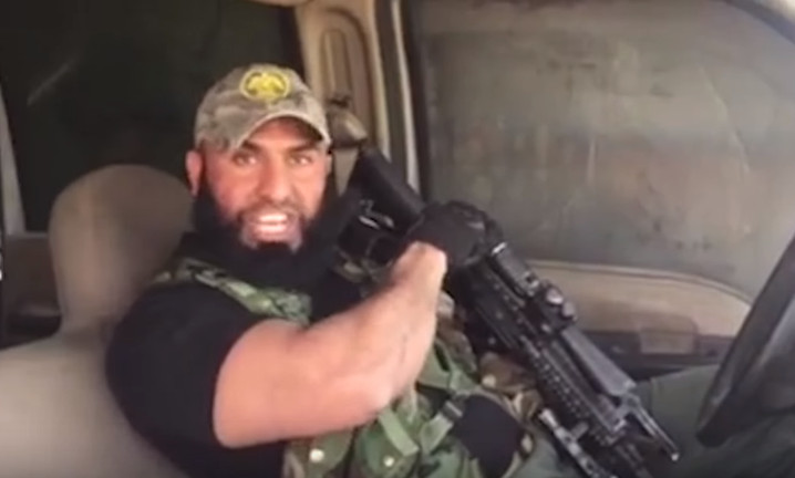 ▲身材壯碩、留著一臉落腮鬍的阿尤布手裡拿著機關槍,誓言殲滅IS。(圖/翻攝自Youtube)
