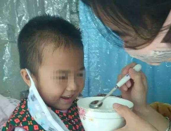 ▲媽媽餵她吃飯,4歲半的靜靜露出笑容。(圖/揚子晚報)