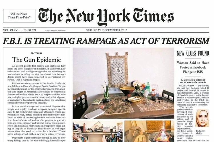 紐約時報五日罕見地將社論刊登在頭版,痛批美國槍枝氾濫,要求國會議員加強槍支管制。這是紐時從1920年以來首次將社論刊在頭版。紐約時報的社論臉書粉絲專頁也刊出一張照片,寫道「在敘利亞難民危機陷入歇斯底里的三個禮拜,同時間在美國有2000人因槍擊案而死亡。」
