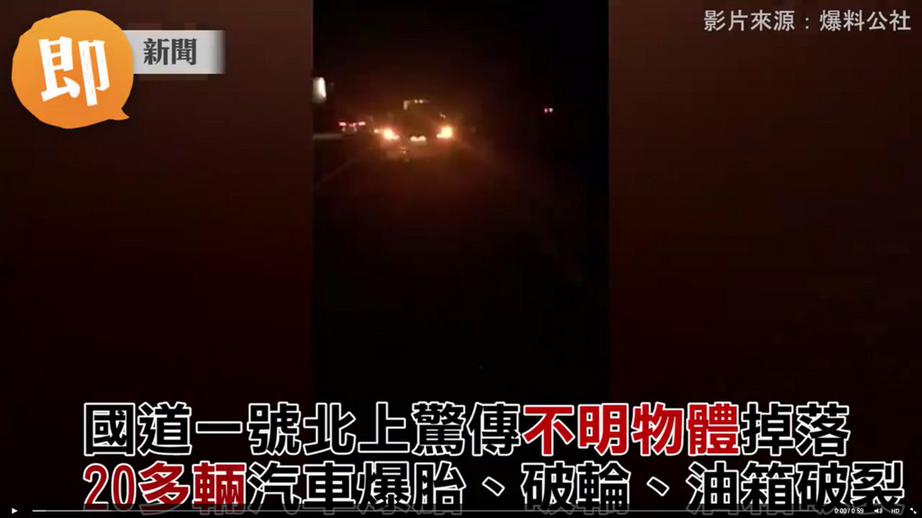 國道傳不明物體掉落事故,7日晚間9點網友在臉書社團《爆料公社》上傳影片,表示國道1號北上112公里驚傳不明物體掉落,導致近20輛車爆胎、破輪及油箱破裂,無法行駛。