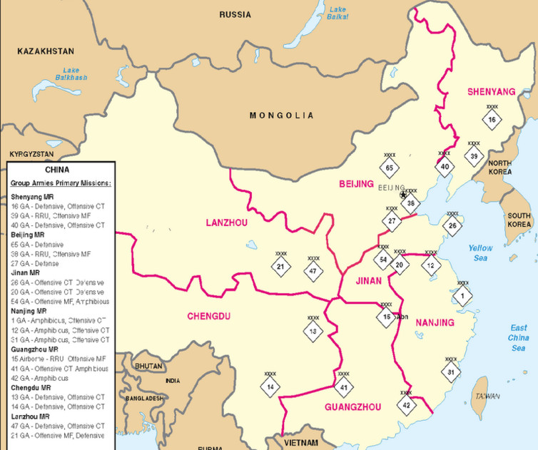 ▲中國目前的七大軍區,分別是瀋陽軍區、北京軍區、蘭州軍區、濟南軍區、南京軍區、成都軍區和廣州軍區。(圖/翻攝自維基百科)