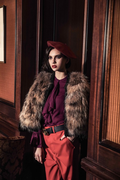 ▲ 紫色荷葉裝飾襯衫,NT$48,800、紅色長褲,NT$33,400、黑色皮革雙G Logo皮帶,NT$18,600、紅色貝雷帽,NT$9,400。All by GUCCI SHIATZY CHEN 棕色皮草外套,價格店洽。TASAKI 紅石榴石珍珠戒指,NT$74,300。