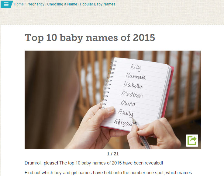 還記得第一天在英文課堂上,老師幫你取的英文名字嗎?在進入校園、踏入職場後,使用率有可能增加,這代表了個人的形象,也能成為永久的綽號。除了中文名,很多父母也想幫家中寶貝選個特別的英文名字,為了避免涵義不雅或超通俗的菜市場名,輪到老外耳裡顯得滑稽,美國育兒中心Baby Center近日發佈2015年寶寶名字排行,幫助你找些靈感!