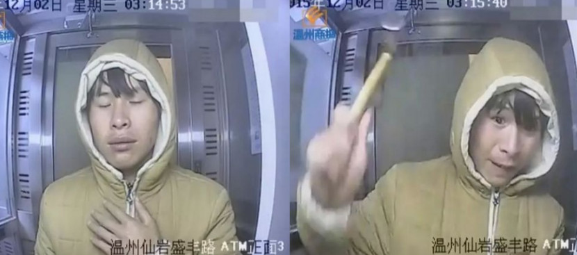 浙江溫州一名男子穿著土色連帽外套,在2日凌晨3時左右跑到ATM前,短短幾分鐘內上演各種內心戲,一下摩拳擦掌,然後又是閉眼拍胸,最後下定決心,拿著鐵鎚亂砸機器介面。對此,當地警方表示,如果男子主動投案會從寬處分。