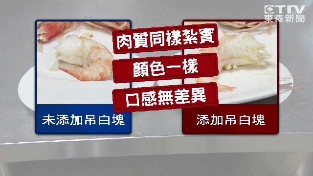 接著撥開來比較一下,兩支蝦子的的肉質同樣,顏色跟口感也無差別,換句話說,商家如果添加「吊白塊」的話,從外觀上完全無法判斷。對此,開南商工實驗研究組教師張丕白就說,基本上,這些加了吊白塊的蝦子,會先活蹦跳一陣子,當你帶回家後,可能就死了,這樣子的活力只能維持20分鐘。