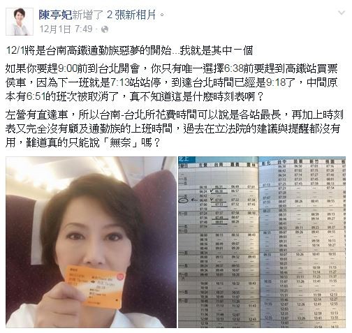 高鐵1日起增苗栗、彰化、雲林站,但台南幾乎沒有往台北的直達車,且每站都停,引起不少民眾抱怨。而民進黨立委陳亭妃也在臉書上提到,這將是台南高鐵通勤族惡夢的開始,因為她平常為了趕在9點前到台北,都搭6點51分的班次,但這班次停駛,讓她因此要改搭6點38分的車。此文一出,卻引來不少網友批評。