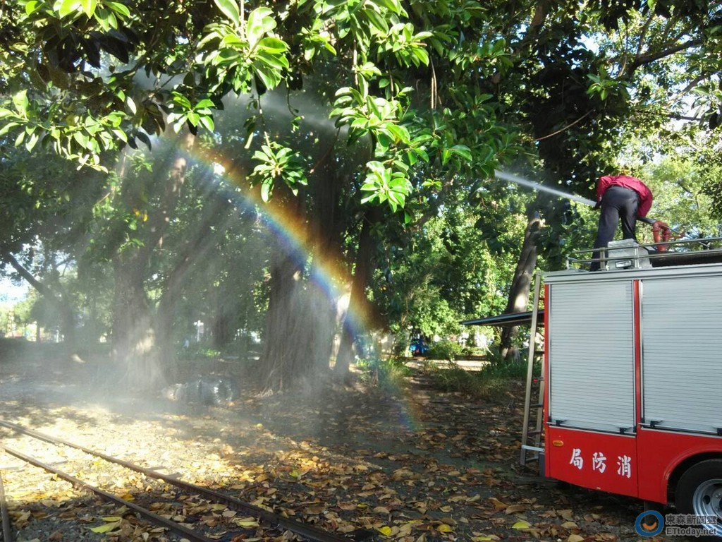 嘉義市政府消防局10日下午15時許接獲報案,得知忠孝路阿里山鐵道旁「森林鐵道車庫」外有蜂群圍繞。後湖分隊人員抵達現場後,在附近樹梢上發現一虎頭蜂巢,直徑約40公分大,由於高度有6米高,無法架梯以人力摘除,最後消防人員決定立即以水柱清除蜂窩。
