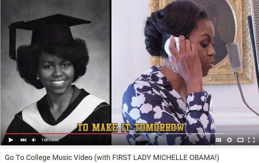 蜜雪兒先後於知名學府普林斯頓大學,以及哈佛大學就讀,畢業後更成為一名傑出的律師,來自芝加哥普通家庭的她,深知教育對人生的影響,也因此一直以來都非常關注於該議題。在最新的「音樂錄影帶」中,蜜雪兒與以模仿歐巴馬出名的演員法洛合作,又唱又跳的鼓勵民眾接受高等教育。