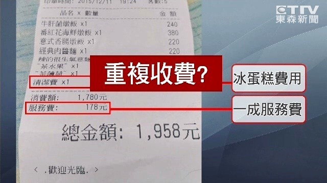 本來業者已經說好,外帶蛋糕慶生要加收200元清潔費,但葉女卻說,「我看帳單的時候才發現,原來他清潔費收的是三百元,之前告知跟實際收費好像不一樣,這樣有點不合理,我們覺得說我們是被騙進去強迫消費的。」而且最後總價的一成服務費也照收,讓她覺得業者重複收費。