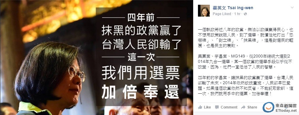▲民進黨主席暨總統參選人蔡英文13日在臉書貼文。(圖/翻攝臉書)