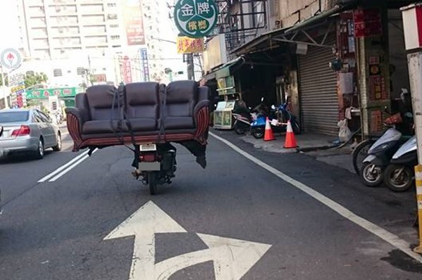 原PO寫道,照片拍攝鳳山鳳林路,「阿伯你太神了… 騎車都搖搖晃晃了,還闖紅燈」;照片中,阿伯用繩子將沙發固定在機車後座,沙發重量看起來不輕。